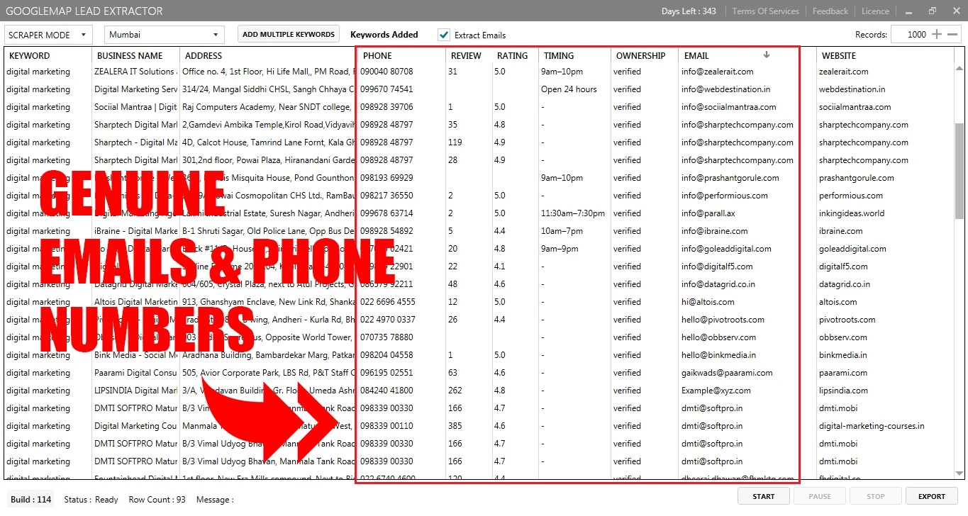 Extract premium unlimited business / company contacts from public listings on Google business directory with no manual effort. It is one of the fastest software available in the market. GoogleMap Lead Extractor is a tool that collect contact information such as Company Name, Location, Complete Address, Email, Mobile & WhatsApp Number, Ratings and Reviews, Location co-ordinates, Website URL and other important information from Google Business Directory.