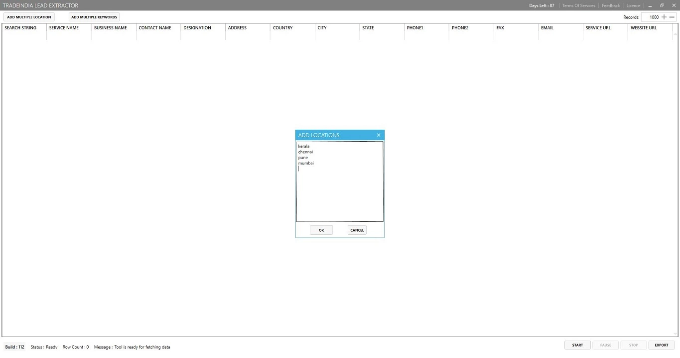 Extract premium unlimited business / company contacts from public listings on Tradeindia website with no manual effort. It is one of the fastest software available in the market. Tradeindia Lead Extractor is a tool that collect contact information such as Company Name, Location, Complete Address, Email, Mobile & WhatsApp Number, Ratings and Reviews, Location co-ordinates, Website URL and other important information from Tradeindia Website.