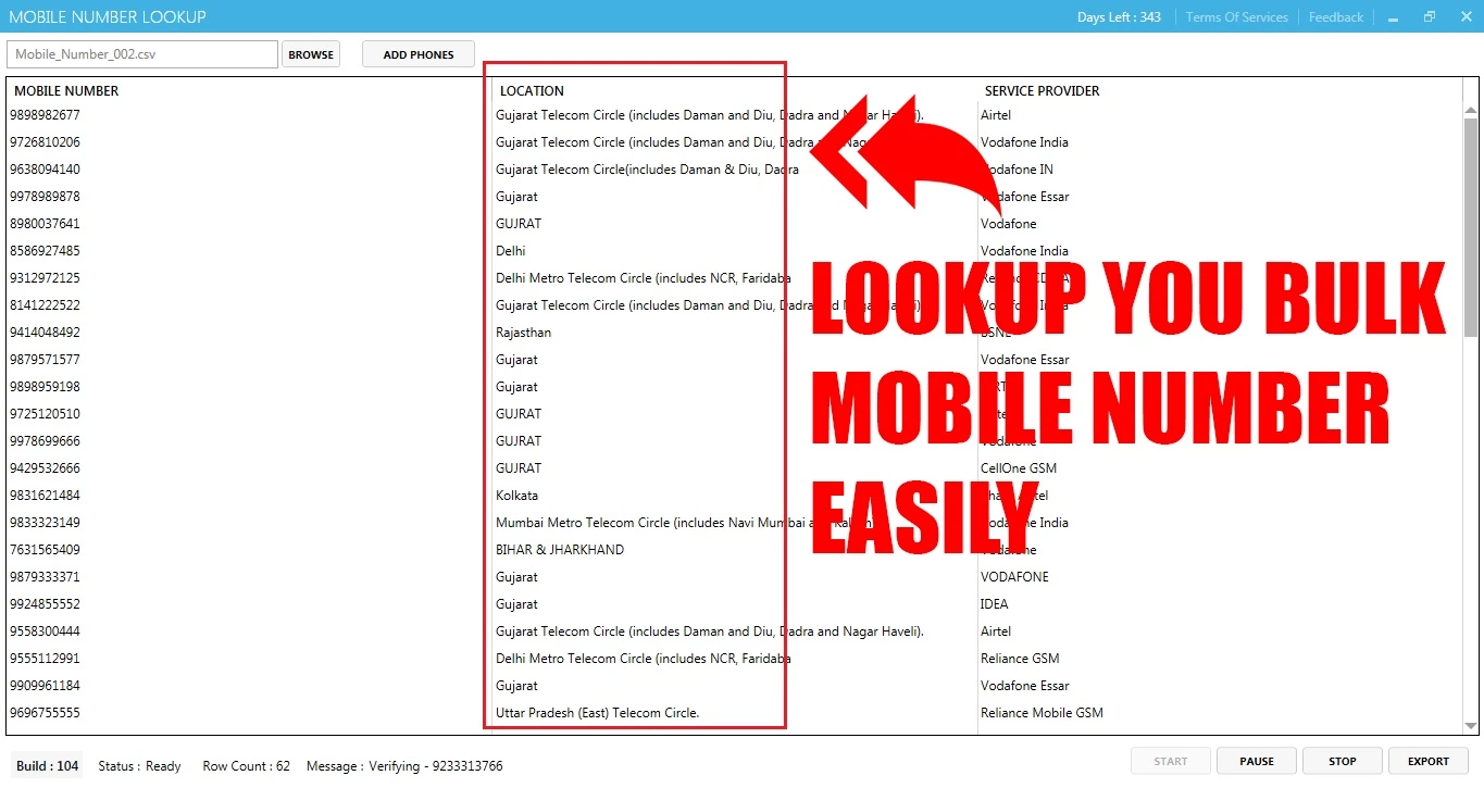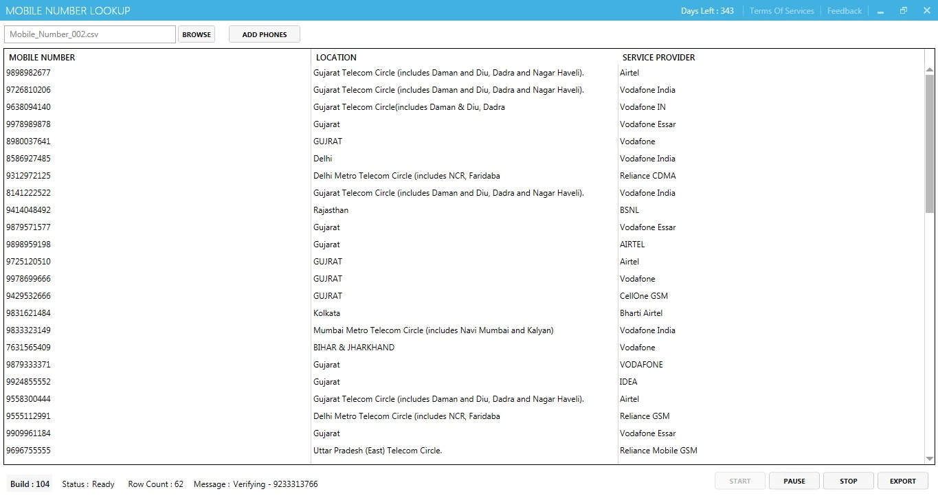 Filter bulk unlimited contacts with no manual effort. It is one of the fastest software available in the market. Mobile Number Lookup is a tool that collect information such as State, Service Provider and other important information from Source Site.