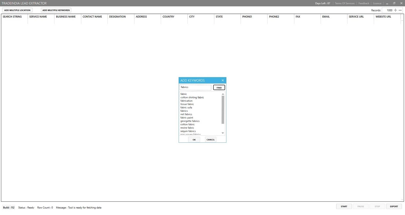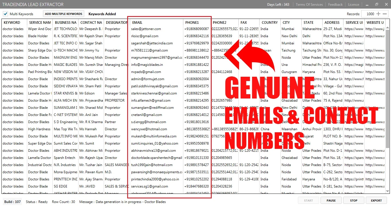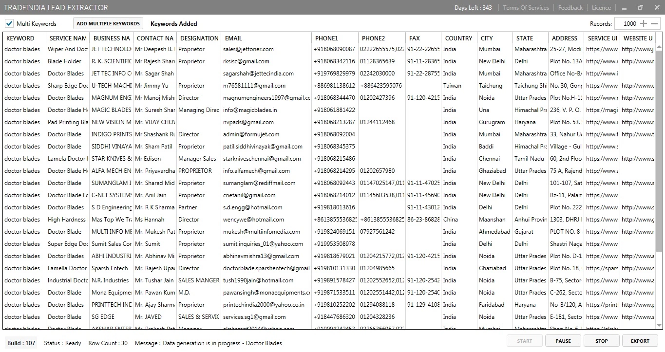 Extract premium unlimited business / company contacts from public listings on Tradeindia website with no manual effort. It is one of the fastest software available in the market. Tradeindia Lead Extractor is a tool that collect contact information such as Company Name, Location, Complete Address, Email, Mobile & WhatsApp Number, Ratings and Reviews, Location co-ordinates, Website URL and other important information from Tradeindia Website.